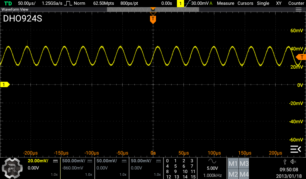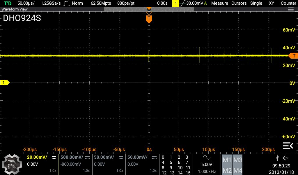 정상 작동하는 에너지미터에서 Y2의 아래쪽 단자나 C34의 위쪽 단자를 오실로 x10 프로브로 찍어보면 아래와 같이 32.768 kHz 출력을 확인할 수 있습니다.