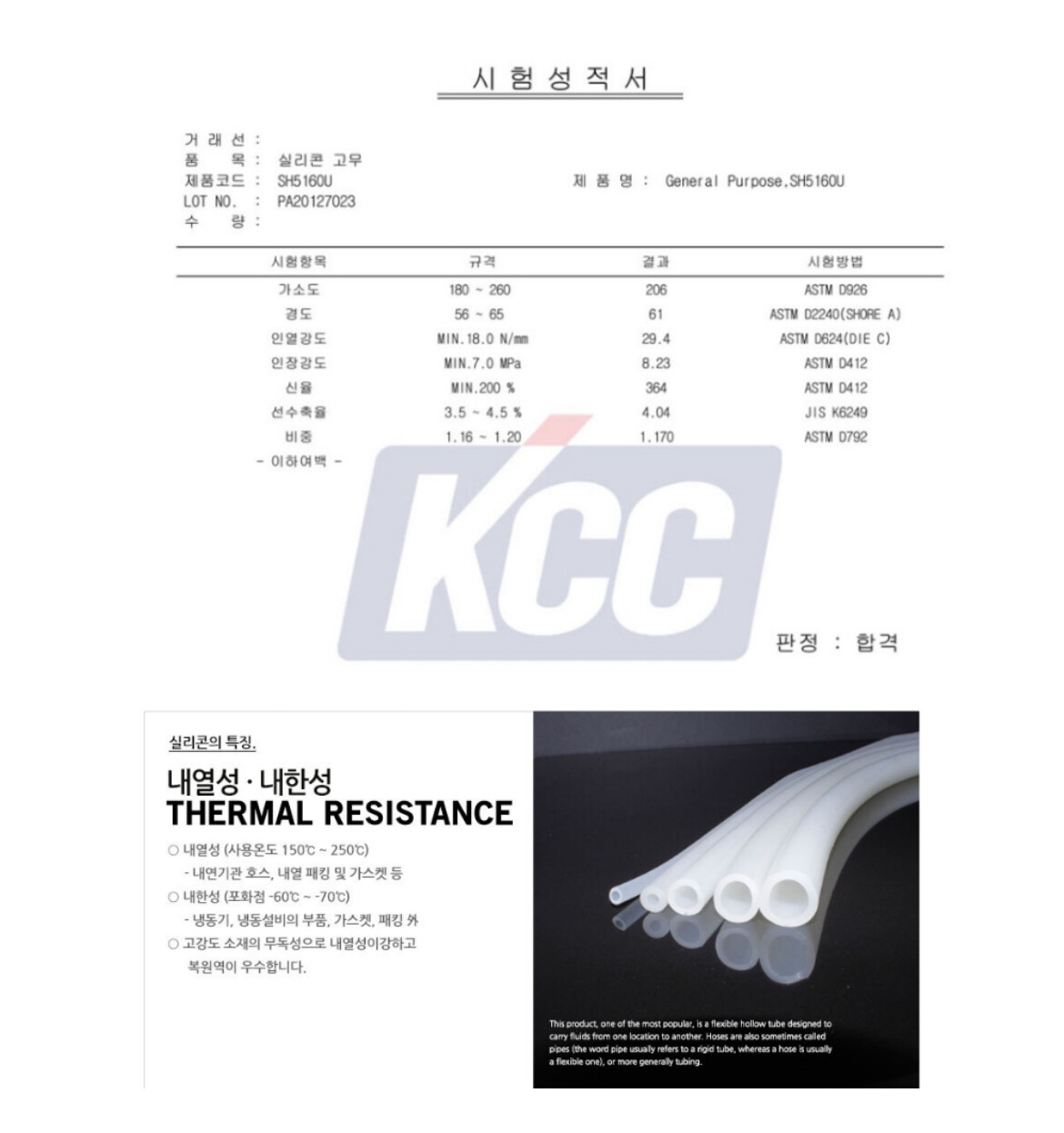 저희 팀은 작년 차량에도 사용하였던 냉각수용 호스를 이번 시즌에서도 사용할 예정이었습니다. 아래와같이 KCC의 150도 이상의 내열성을 인증받은 시험 성적서가 있는 호스입니다.